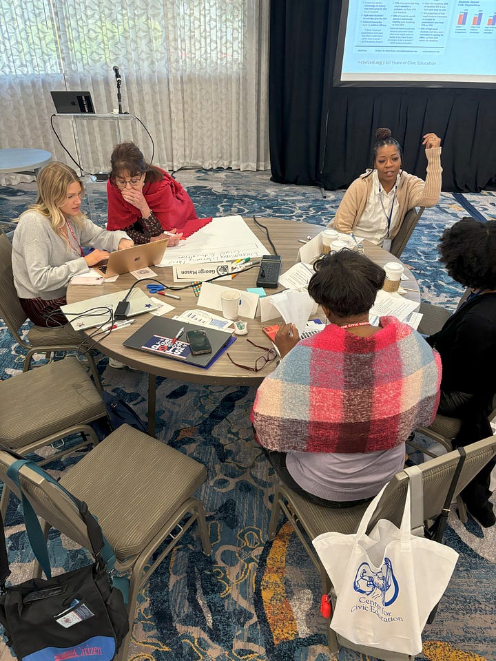 Each table buzzed with creative ideas as the activity transformed the conference room into an innovation hub. Groups were provided with poster boards, stickers, markers, and other craft supplies. Educators dove headfirst into the research, collaborating to determine what data best illustrated the impact of CEAS to reach their target audience and goals. While all posters emphasized that We the People students had gained civic knowledge and skills, each poster told its own story, capturing unique perspectives on the program's impact. Common themes emphasized the need to start civic education early and the benefits of We the People in teaching 21st century skills.
